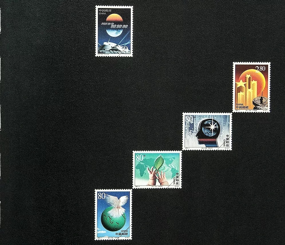 (5-1)邮票为“迈入21世纪——世纪交替”,背景为浩翰深邃的太空,在旭日的下方铭刻着标志时空转换的历史时刻:2001 01 01 00:00:00。意喻地球在宇宙中不停地运转,今天终于迎来新世纪的太阳。